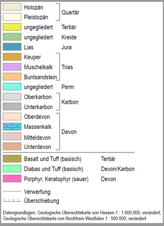 On the eastern edge of the Slate Mountains, Zechstein-age limestones mark a former seashore, running like a blue ribbon through the Geopark (blue). Extensive red sandstone landscapes (orange) in Burgwald and Nordwaldeck represent the beginning of the Mesozoic. Extinct volcanoes characterize the landscape in the "Wolfhager Land" (purple). Finally, the youngest rocks are found in the southwest of the park with the lignite deposits near Borken and the ice-age gravel deposits between Fritzlar and Wabern (yellow). The highest mountain reaches 843 m near Willingen (Upland), the lowest point in the Schwalm floodplain 159 m.
