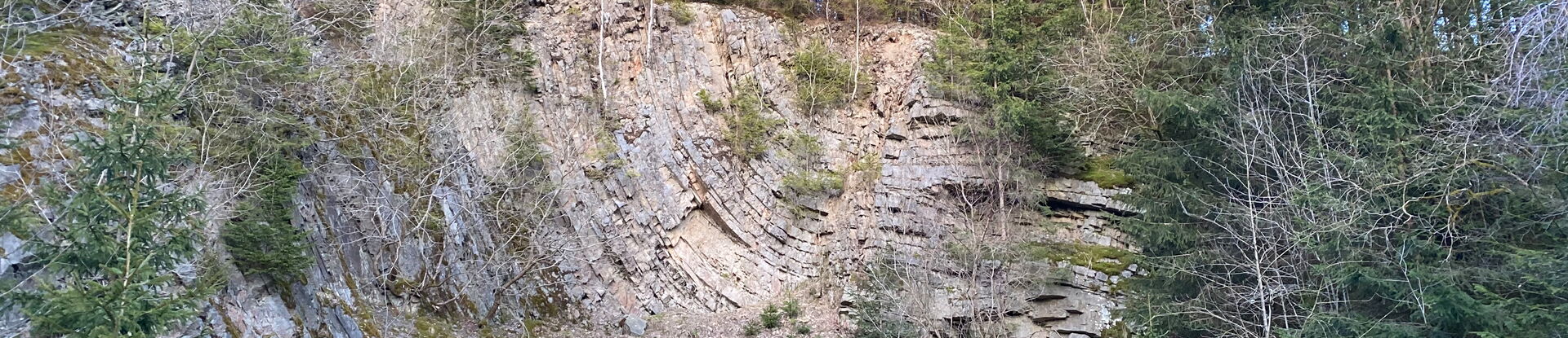 The rocks of the Wetzstein consisting of sandstones and mudstones have an age of about 390 million years and can be assigned to the Lower Middle Devonian. The formation of the Rhenish Slate Mountains and tectonic activity formed folds in the form of saddles and hollows, which are exposed here in the quarry and allow insights into the Paleozoic.